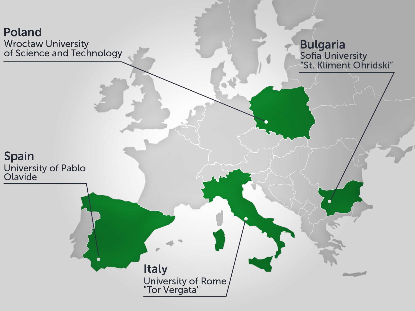 The program is realized at 3 Full Higher Education Institution Partners from 4 European Union countries: Wroclaw University of Science and Technology (WUST, Wroclaw, Poland), Sofia University “St. Kliment Ohridski (SU, Sofia, Bulgaria), University of Pablo Olavide (UPO, Sevilla, Spain) and Tor Vergata University of Rome (UNITOV, Roma, Italy).